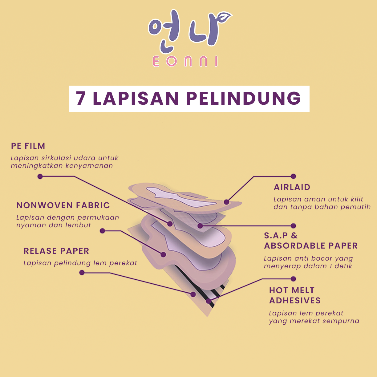 • Airlaid: Lapisan aman untuk kulit tanpa bahan pemutih.